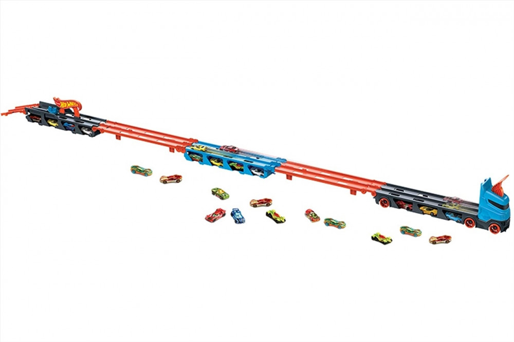 Autószállító kamionon vagy versenypálya? Legyen mindkettő! Az új Hot Wheels 2 az 1-ben ultimate szállító tele van kisautós meglepetésekkel. A kamionra több, mint 20 kisautó felfér, amelyek a kis ablakokon keresztül látszanak. Ha viszont a szállító rámpák kinyílnak, egy csaknem 2 méter hosszú, kétsávos versenypálya bontakozik ki. A versenyzők a pilótafülkéből kilövővé változtatható start vonalról indulva mérhetik össze a gyorsaságukat, miközben a várakozó autók a pálya alatti tárolókban izgulhatják végig a futamokat.
