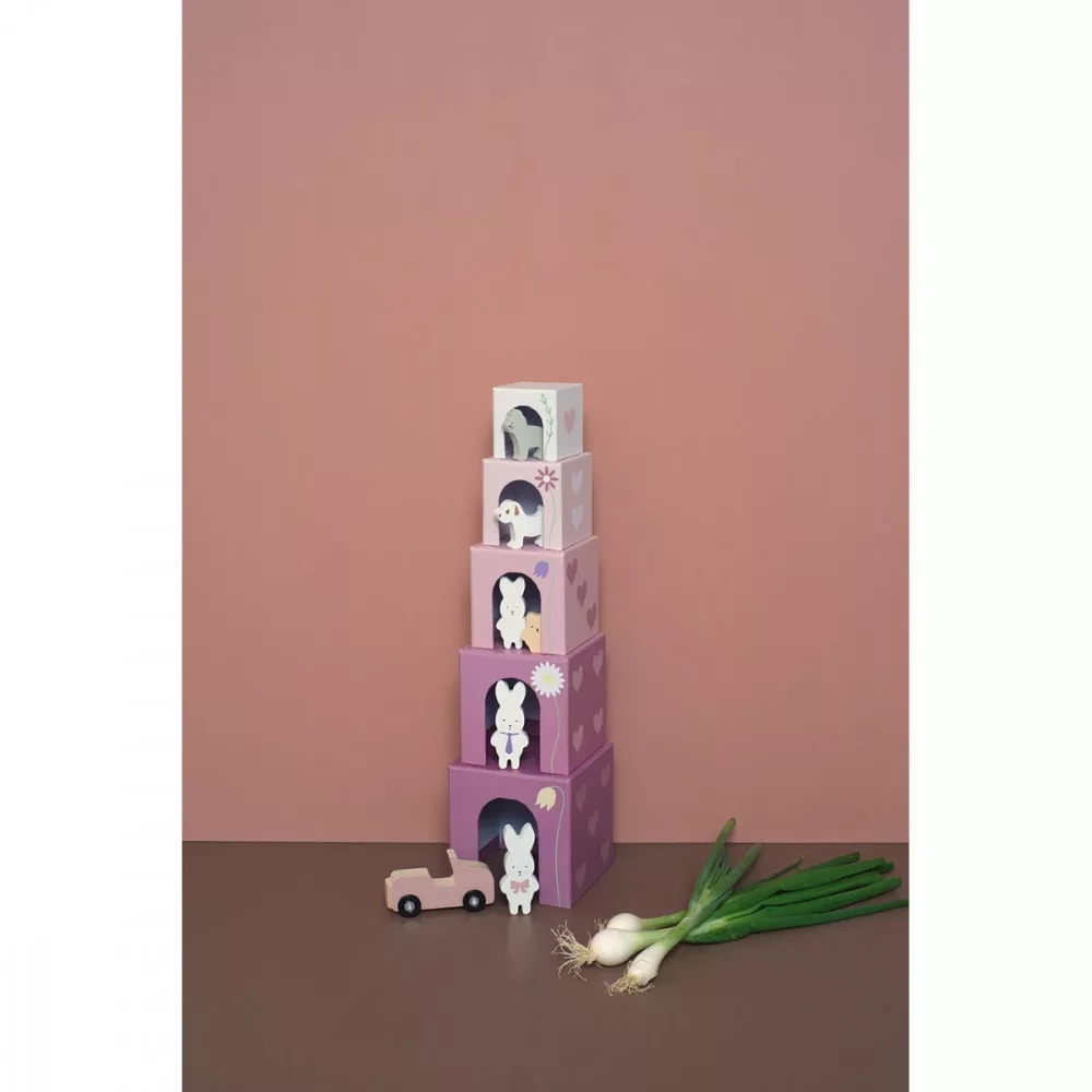 A készlet tartalma 5 egymásra építhető kocka, 1 autó, 1 mackó, 1 kutya, 1 macska, 3 nyuszi