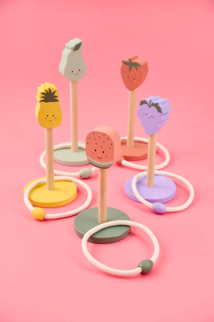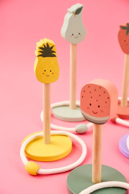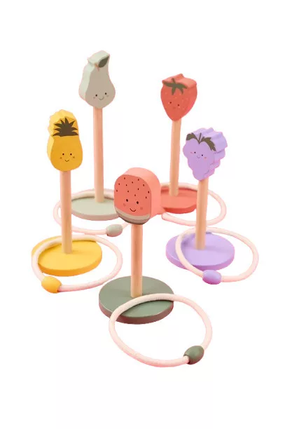 Készen állsz egy színes gyümölcsös játékra? A Jabadabado karikadobáló játékával a gyerekek szórakoztató és izgalmas módon gyakorolhatják célzási képességeiket és koordinációjukat. Célozz a cuki fa gyümölcsfigurákra, és kezdődjön a játék! Tökéletes baráti versenyekhez és sok nevetéshez a szabadban. A készlet öt fa gyümölcsfigurát tartalmaz – áfonyát, görögdinnyét, eperet, körtét és ananászt – valamint öt kötélkarikát.
