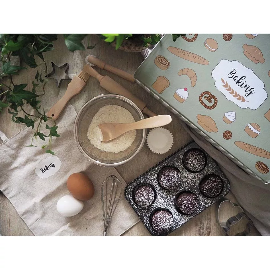 A készlet sodrófa, tálat, habverőt és még sok minden mást is tartalmaz, mindezt szépen becsomagolva egy kis kukta bőröndbe. Ami pedig a legjobb, a készlet valódi sütéshez is használható, hiszen a muffinsütő tepsi betehető a sütőbe is.