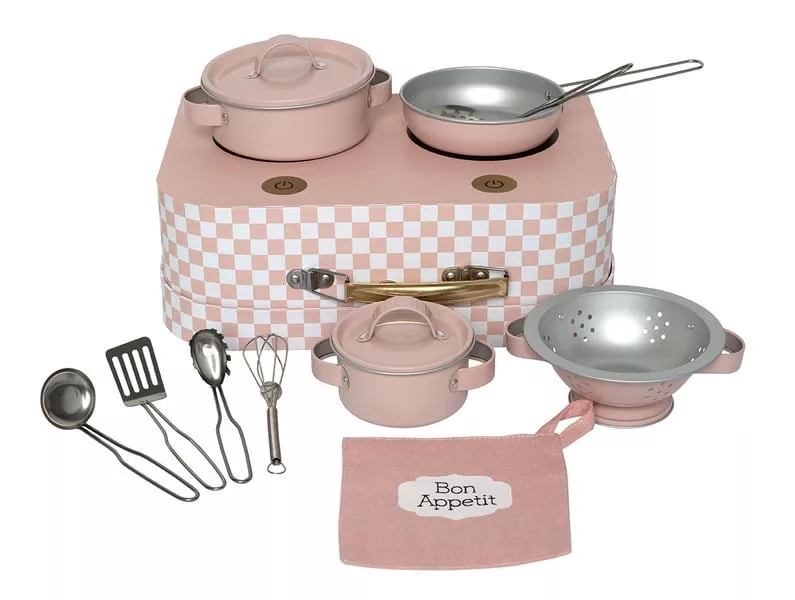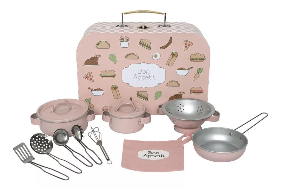 A gyerekek saját kulináris remekműveket alkothatnak ezzel a bájos, lágy pasztellrózsaszín árnyalatokban pompázó konyhai készlettel! A készlet mindent tartalmaz, amire egy kis szakácsnak szüksége lehet, az edényektől és serpenyőktől kezdve az olyan konyhai eszközökig, mint a merőkanál, habverő és spatula. Mindent egy stílusos és praktikus "Bon Appétit" feliratú táskában hordozhatnak, így könnyen rendszerezhető minden darab. Tökéletes szerepjáték, amely fejleszti a képzelőerőt és a motoros készségeket, miközben a gyerekek többet tanulnak a főzésről és a mindennapi feladatokról.