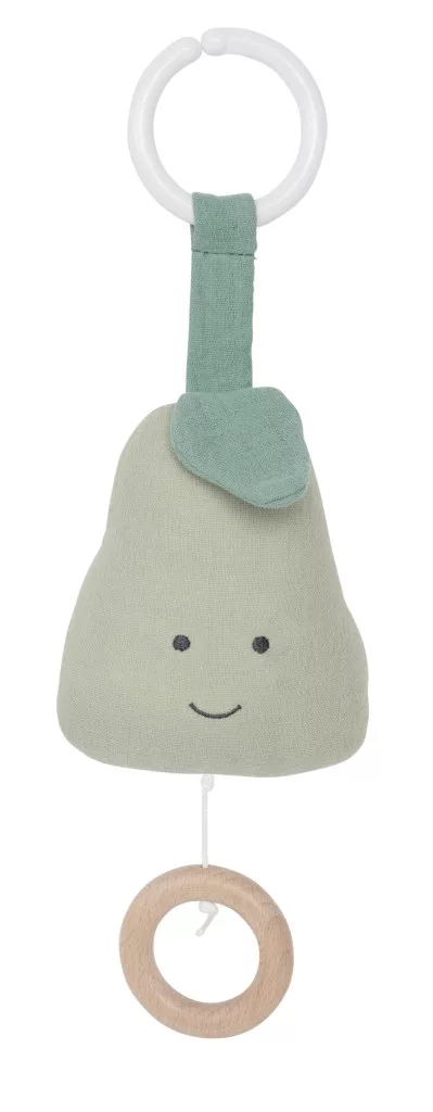 A Jabadabado textil felhúzható zenélő játéka most egy édes körte alakjában lett megtervezve. A játék nyugodt dallamot játszik (Brahms altatódal) és könnyen rögzíthető a rugalmas műanyag gyűrű segítségével. A zene szórakoztatja és stimulálja a babát, miközben álomba szenderül. Nagyszerű ajándék újszülöttnek babalátogatás alkalmából vagy akár keresztelőre.