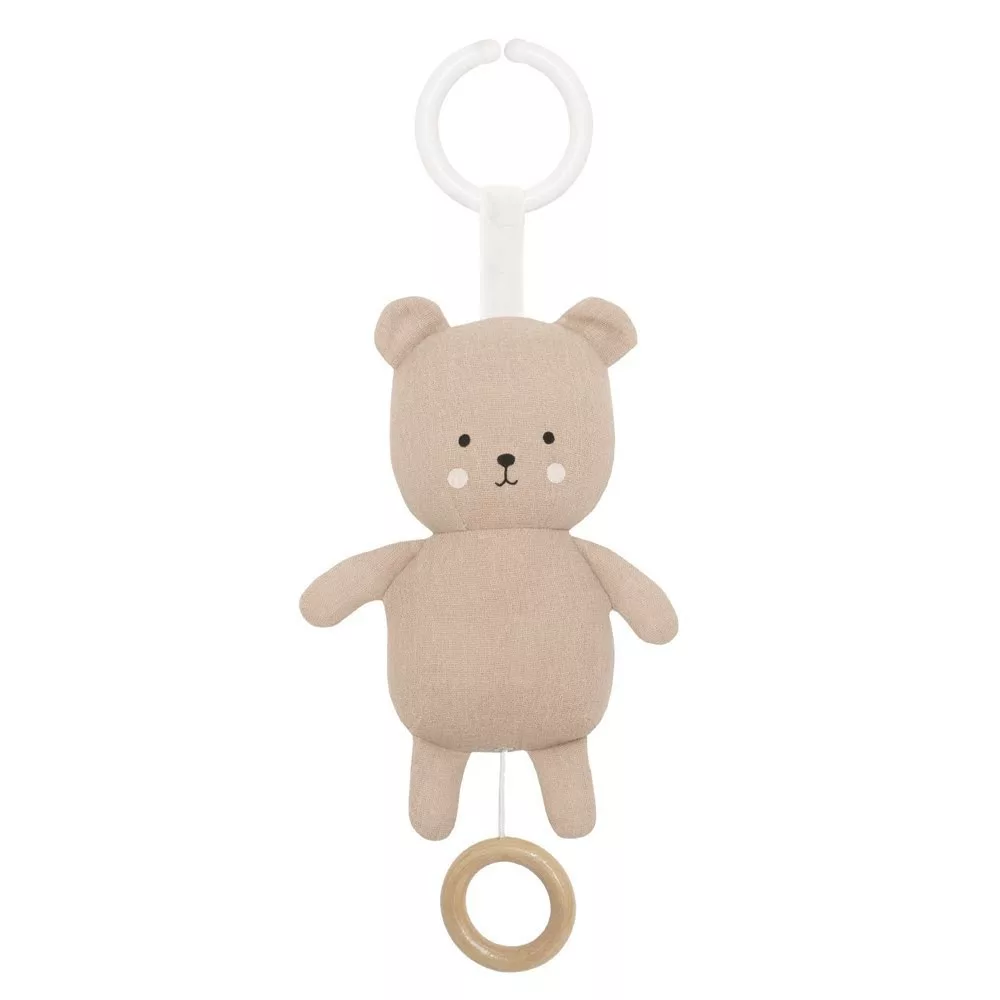 Aranyos zenélő, felhúzhatós maci, amely lágy dallamot játszik. A zenei funkció aktiválásához húzd meg a függő fakarikát. A maci könnyedén felszerelhető a műanyag karika segítségével.