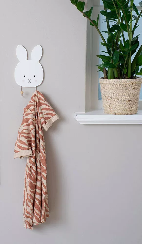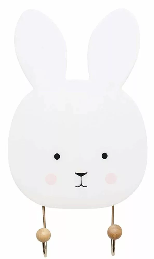 Nyuszi alakú dekoratív fogas a gyerekszoba díszítésére. Szép kiegészítő és egyben praktikus hely a ruhák, hátizsákok, nyakláncok és egyéb tárgyak kényelmes tárolására.