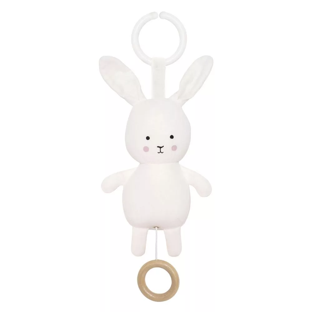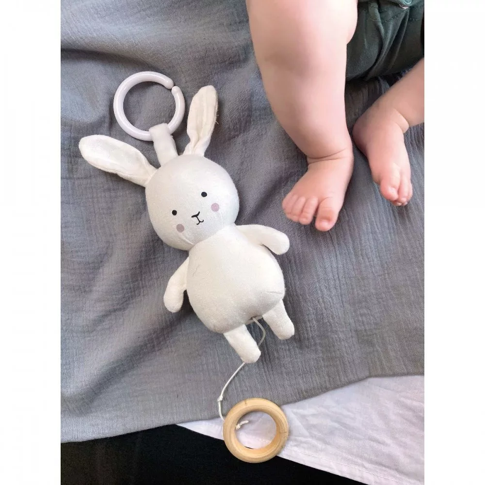 Aranyos zenélő, felhúzhatós nyuszi, amely lágy dallamot játszik. A zenei funkció aktiválásához húzd meg a függő fakarikát. A nyuszi könnyedén felhelyezhető a műanyag karikának köszönhetően.