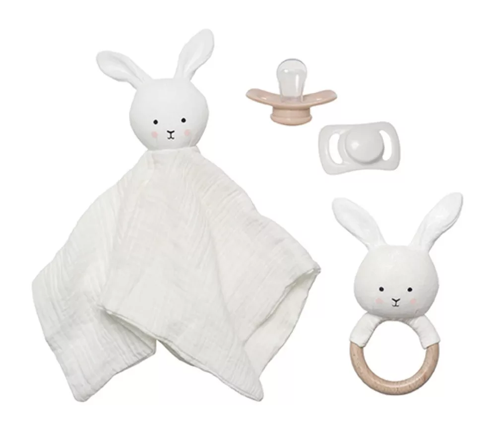 Baba ajándék szundikendővel. Ez az ajándékcsomag tele van imádnivaló nyuszis termékekkel, amelyek hamar nélkülözhetetlenek lesznek a családban.
