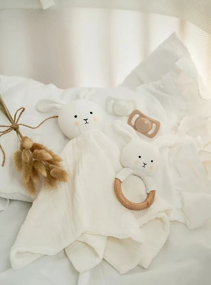 Nyuszis szundikendő: A 100% muszlin pamutból készült kendő a meghitt szunyókálásokhoz és az esti ágyba bújáshoz készült. Tökéletes társ a nyugodt és gyengéd pillanatokhoz.