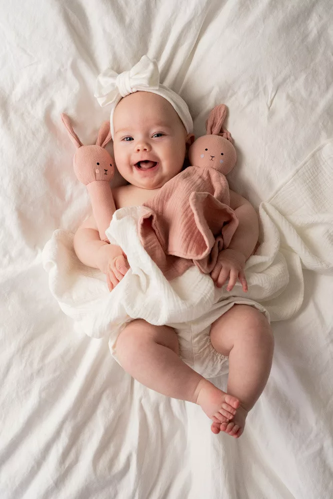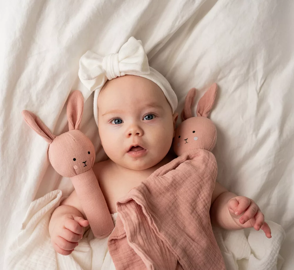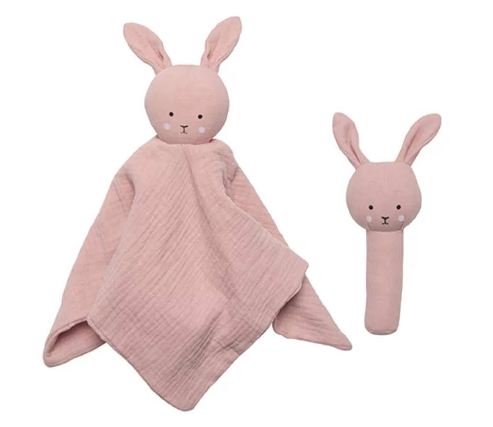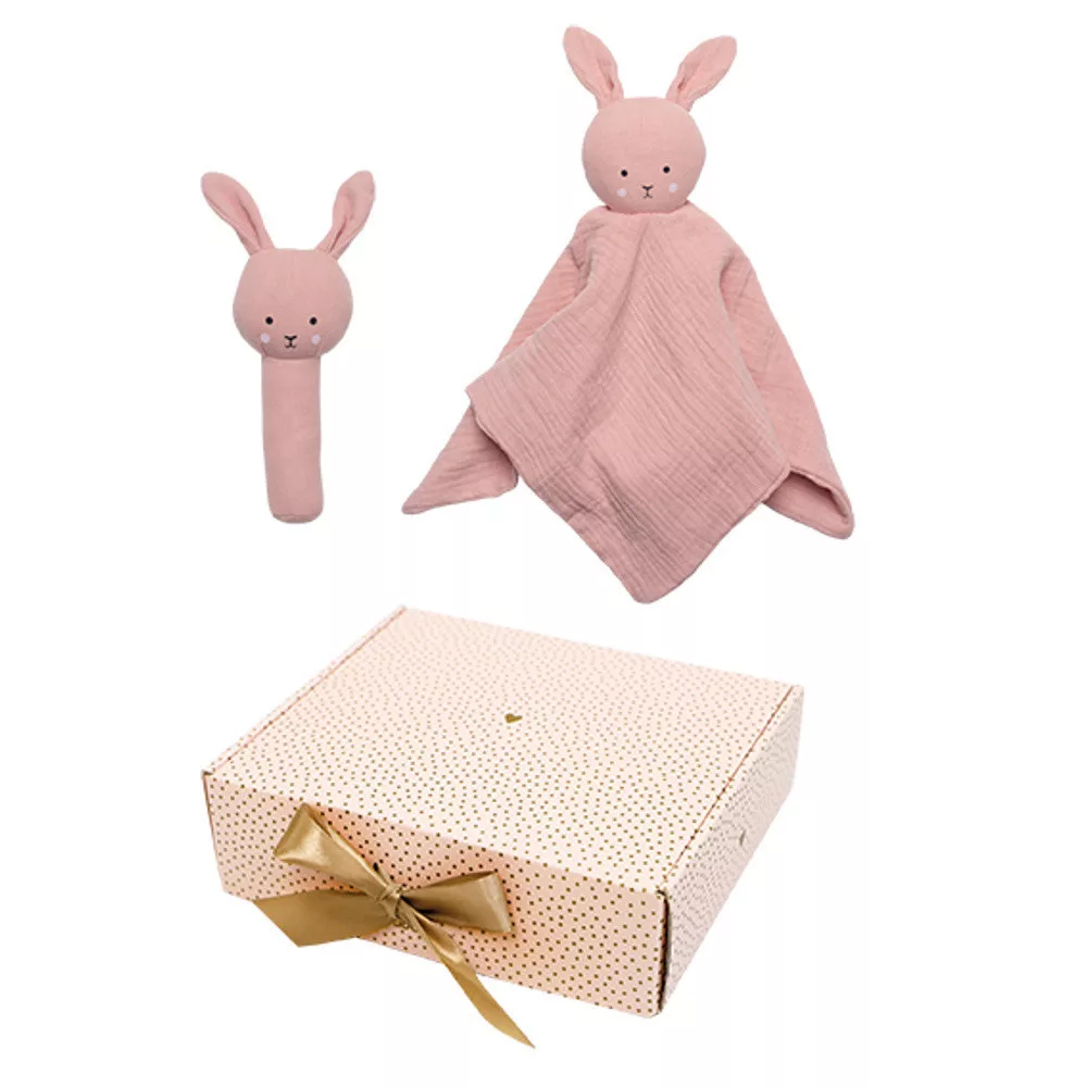 Baba ajándék csomag csörgővel. Ez az ajándékkészlet a két legnépszerűbb rózsaszín nyuszis terméket tartalmazza, szundikendőt és egy csörgőt, mindkettő imádnivaló kivitelben és 100% puha muszlin pamutból.