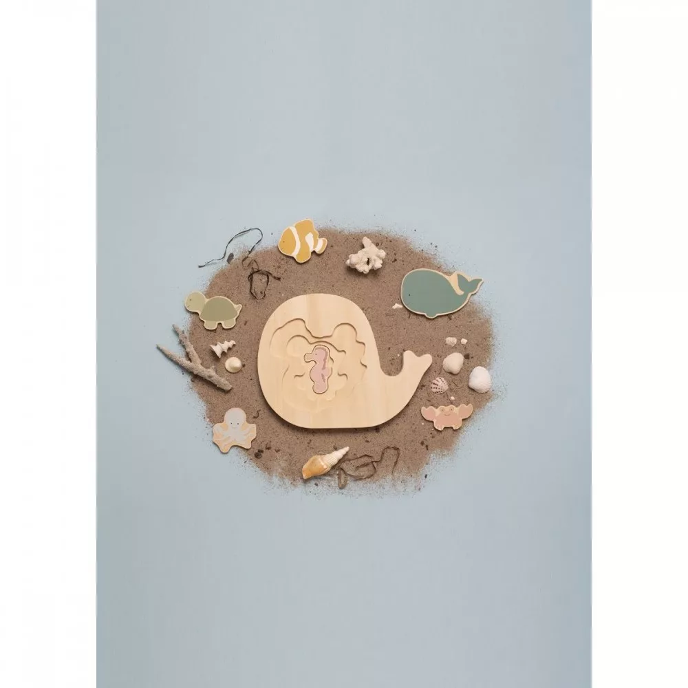 Szórakoztató állatos fa puzzle különböző egymásra épülő rétegekkel. Hat különböző óceáni állatfigura alkotja a kirakós darabokat. A figurák úgy lettek megtervezve, hogy a kis kezekbe is beleférjenek és könnyen megfoghatók legyenek.