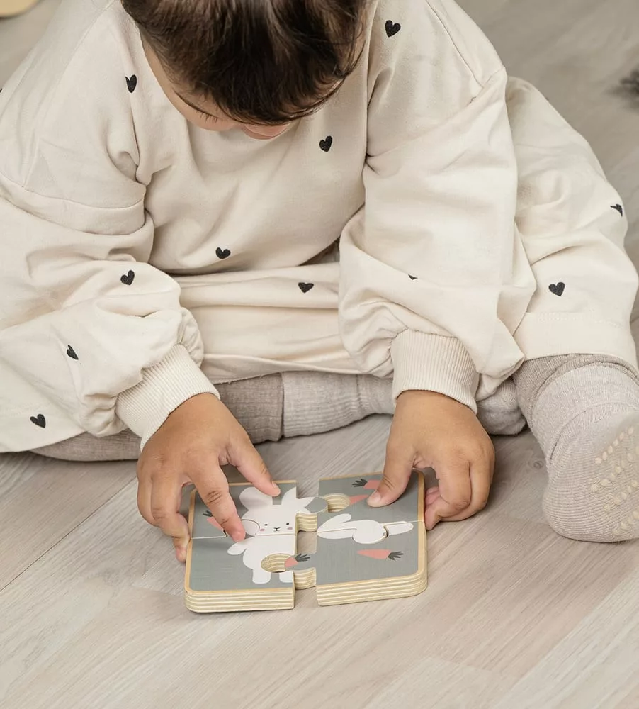 Kirakós játék: Kétoldalas puzzle, amelynek mindkét oldala különböző témájú, így sokoldalú játékélményt nyújt. Az egyik oldalon egy színes puzzle, a másikon pedig egy nyúl puzzle található. A színes puzzle arra inspirálja a gyermeket, hogy a saját képzeletét és kreativitását felhasználva oldja meg, míg a nyúl puzzle kihívást jelent, lehetővé téve a gyermekek számára, hogy felfedezzék a megfelelő mintákat. Ez a kétoldalas puzzle így változatos játékélményt nyújt, amely elősegíti a képzeletbeli felfedezést és a problémamegoldást egyaránt.