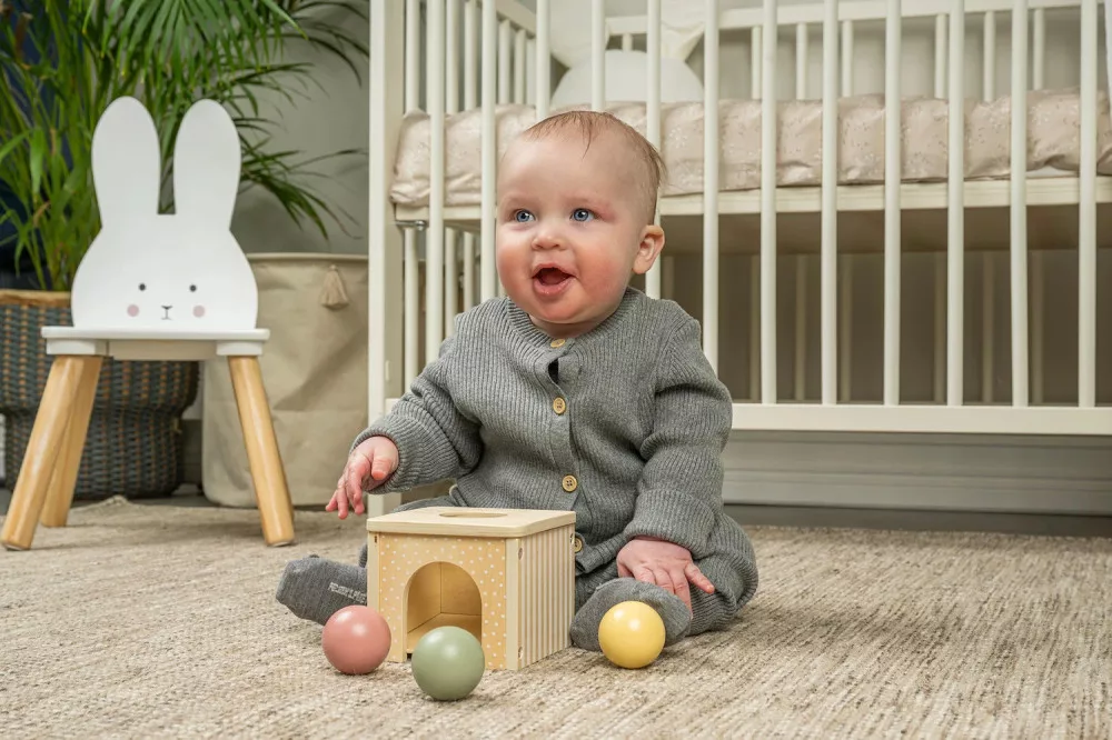 Játssz golyóejtős dobozzal. Ez a doboz elősegíti a babák szem-kéz koordinációjának fejlődését és serkenti a finommotoros készségeket, miközben már egészen kicsi korban felkelti a kíváncsiságot. A megfigyelés révén erősödik a baba koncentrációja, és azzal, hogy figyeli, ahogy a labda eltűnik a dobozban, majd kigurul onnan, a baba kezdi megérteni a dolgok állandóságát.