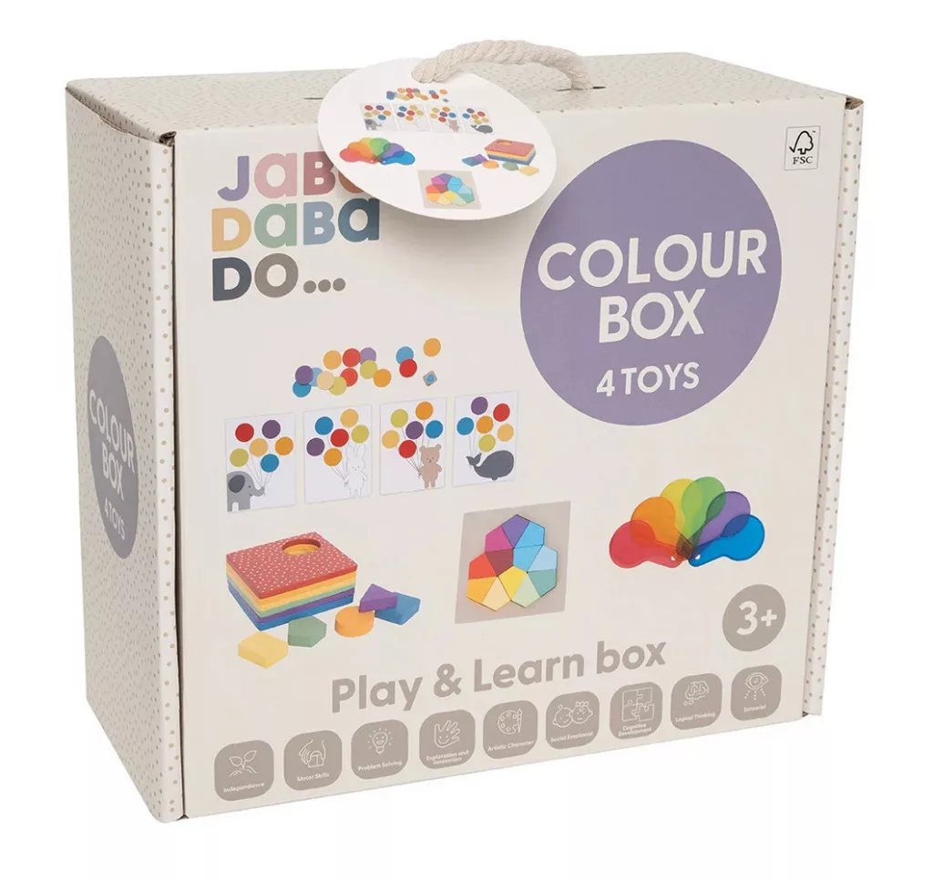 Ez a színes tanulódoboz gondosan kiválogatott játékokat tartalmaz, amelyeket úgy terveztek, hogy a gyermekek számára izgalmas játékidőt kínáljanak, valamint fejlesszék képességeiket. A doboz és a játékok szép és vidám színekben pompáznak, amelyek hosszú időn keresztül stimulálják a gyermekekek érzékeit.