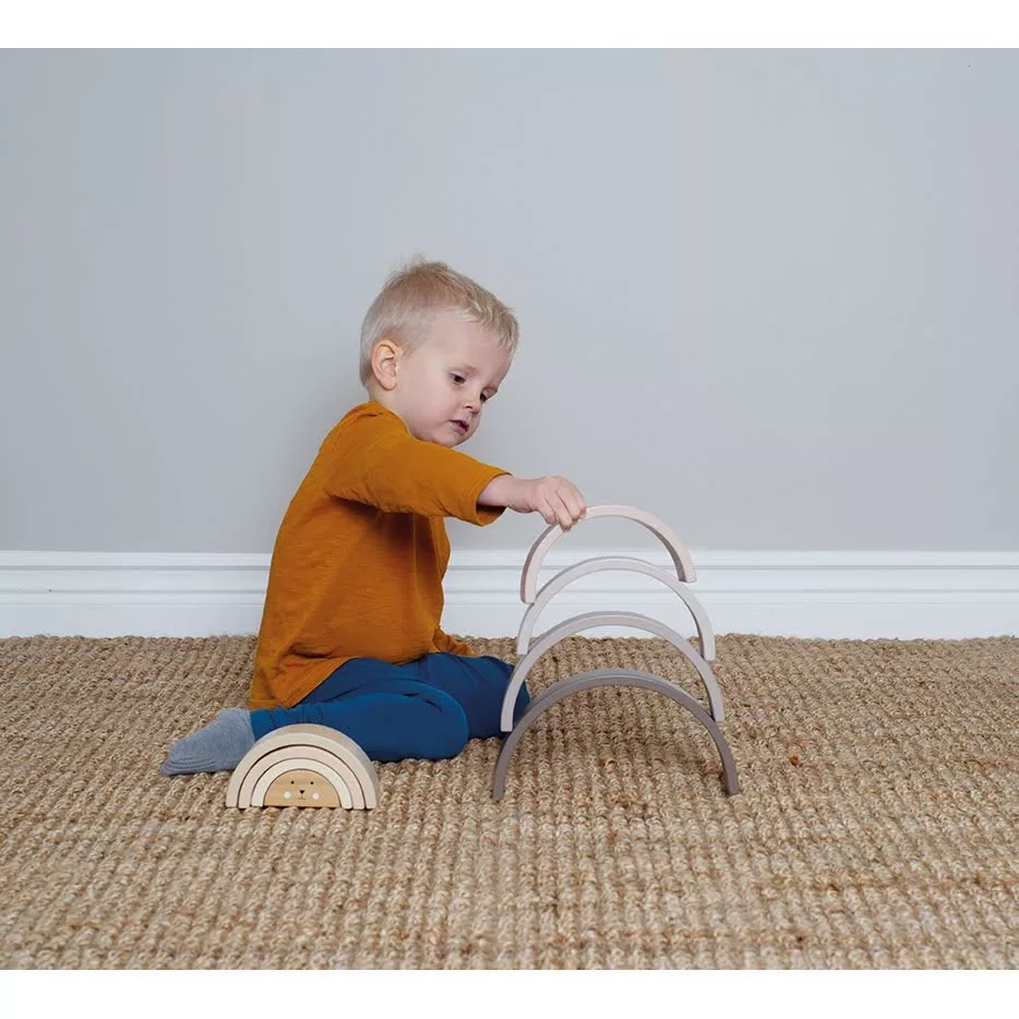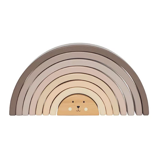 Aranyos készségfejlesztő szivárvánnyal toronyépítő játék, melynek középső elemén egy kedves kis maci arca látható. A játék elemeivel külön-külön is játszhatnak a gyerekek vagy akár egymásra is pakolhatják azokat, így egy nagy tornyot hozhatnak létre. Az elemekből továbbá izgalmas alagutakat vagy hidakat lehet építeni a kedvenc autókkal történő játékhoz! A használatához csak a gyermeki képzelet szab határt.