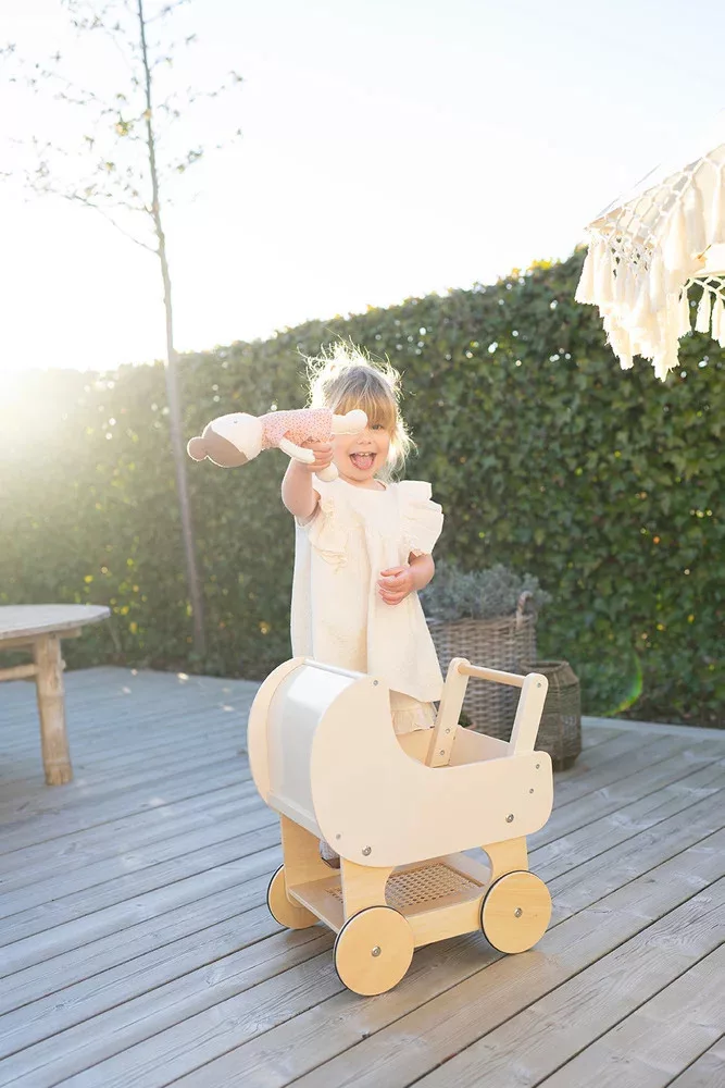 Ideje sétálni! A Jabadabado aranyos, fából készült babakocsija szép krémszínű és dekoratív, rattanszerű részletekkel rendelkezik. Ez egy klasszikus játék, amely tökéletesen illik a gyerekszobába. A gyerekek babáikat, mackóikat a kocsiban altathatják és sétálni vihetik őket. A babakocsi alján egy polc található, ahol szükséges kiegészítő vagy más játékok tárolhatók.