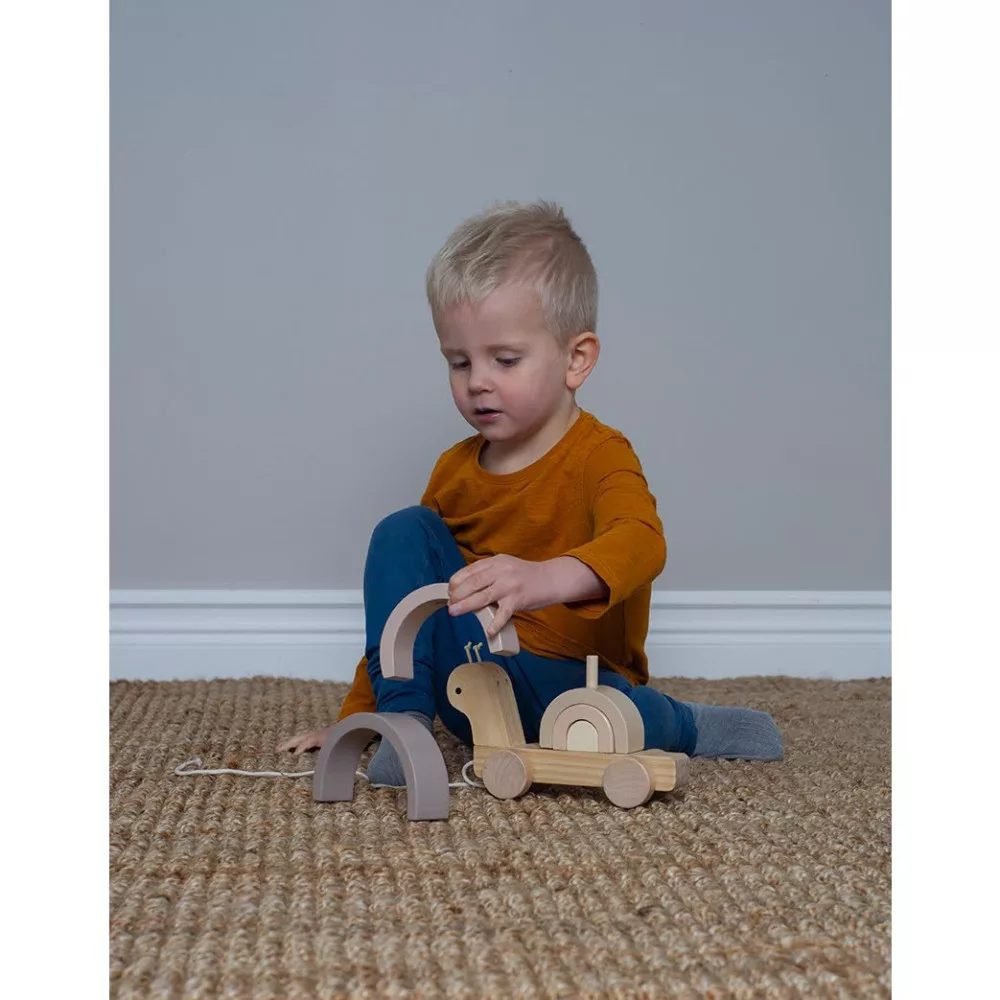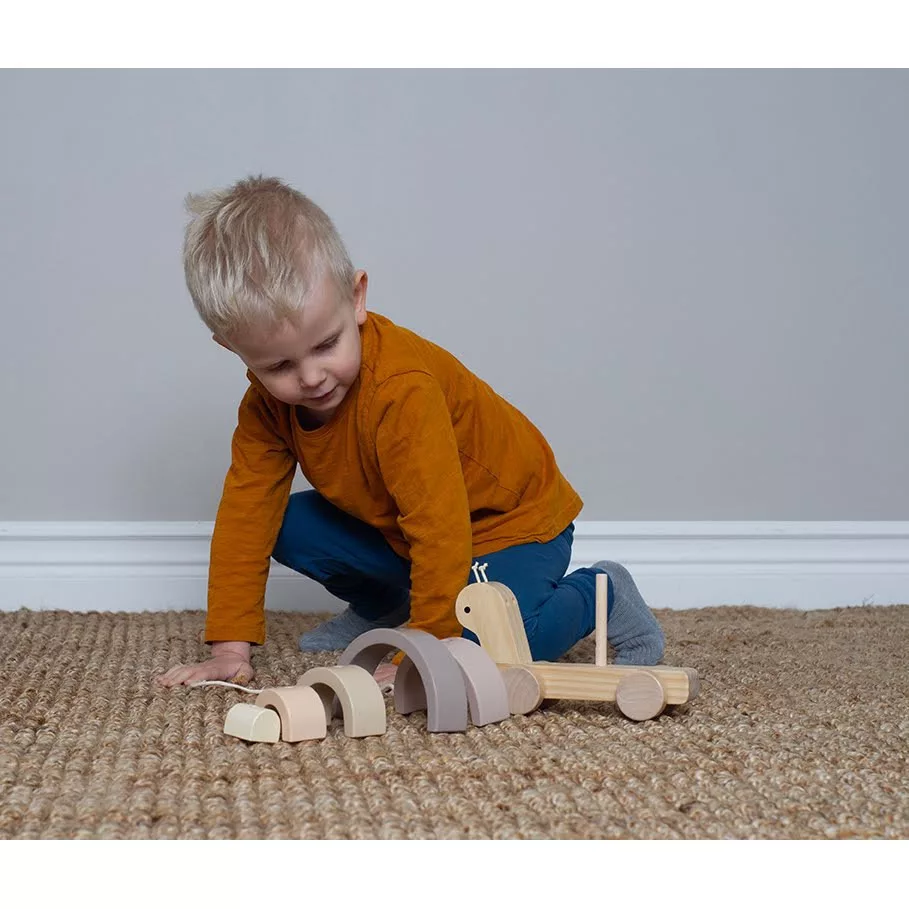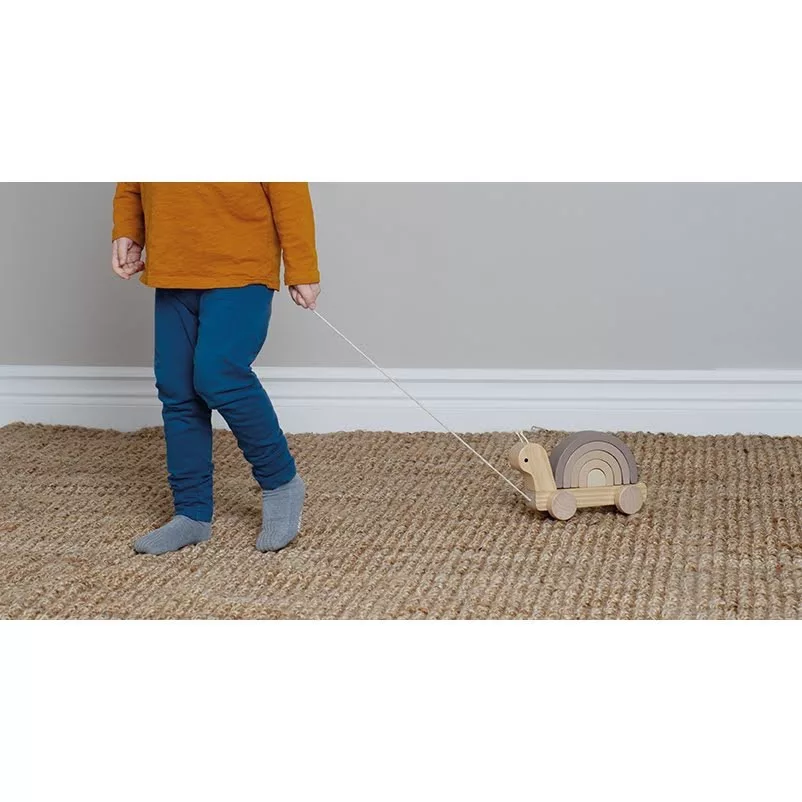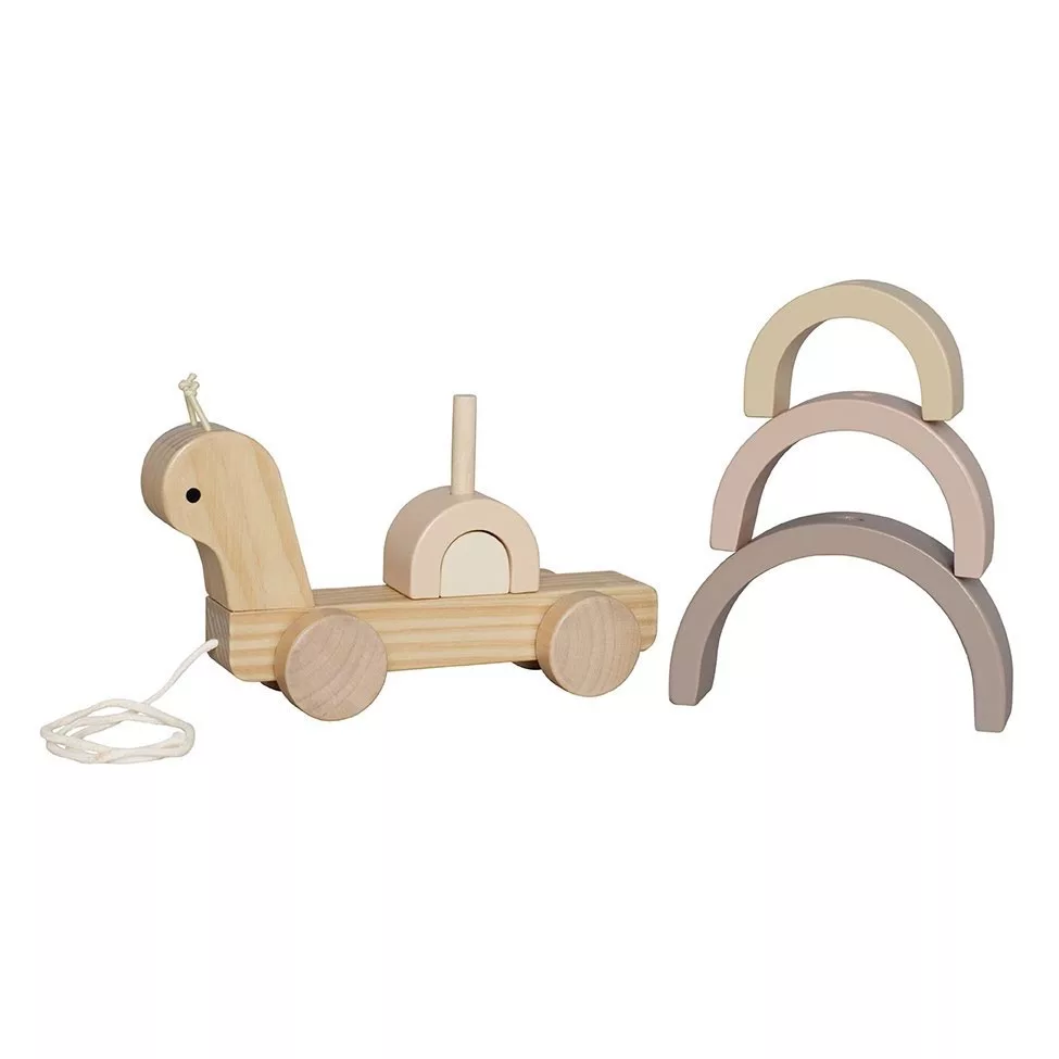 Aranyos, fából készült húzható csiga babajáték, melynek háza egy egymásra építhető szivárvány. A szivárvány elemeivel külön-külön, vagy egymásra rakható játékként is lehet játszani. Például egyes részeiből izgalmas alagutak vagy hidak építhetők a kedvenc autókkal történő játékhoz!