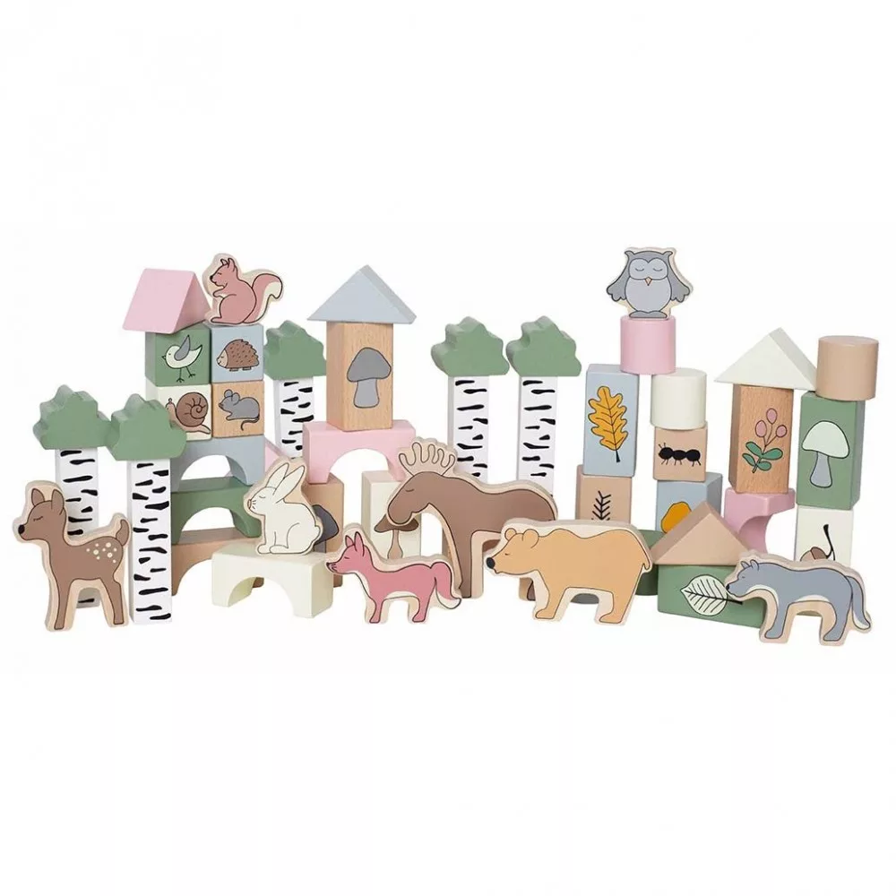 Építőkészlet 50 különböző színű és formájú fakockával, valamint állatfigurákkal.