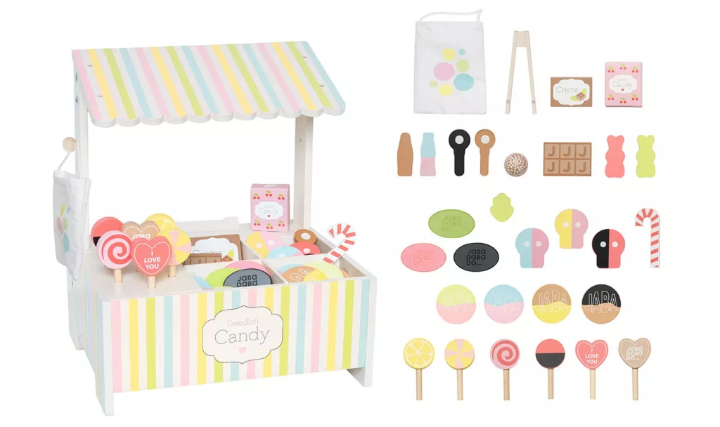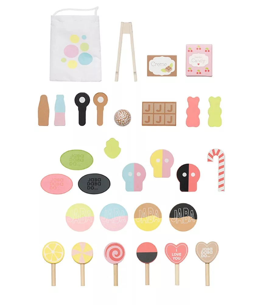 Több mint 25 különböző darab található a készletben, például színes nyalóka, csokoládétábla, cukorka és gumicukorka – mindegyik tartós fából készült. A valósághű játék érdekében a készlet tartalmaz egy szövetzsákot és egy fogót is az édességek kiválasztásához, ami szórakoztató és oktató jelleget kölcsönöz a játéknak.