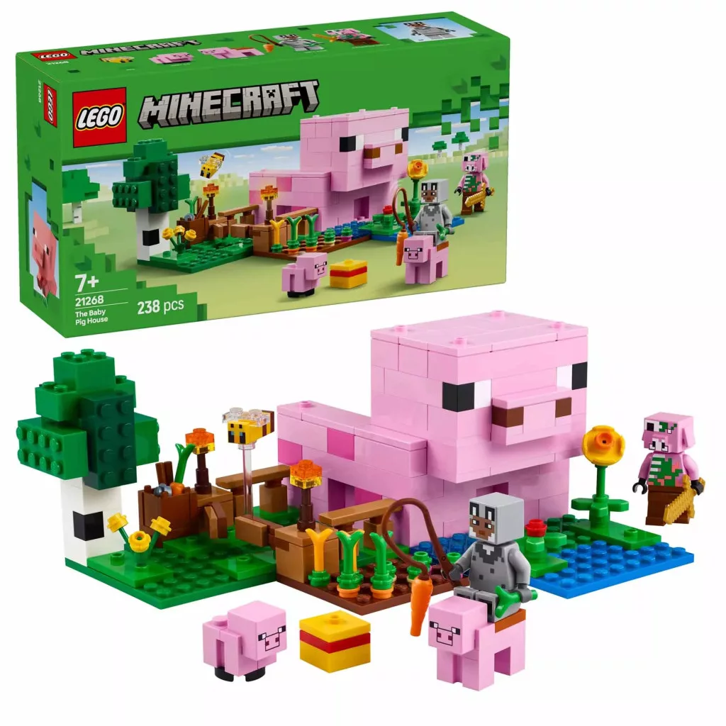 A helyszín a Minecraft erdei biomja, a kreatív, otthonépítős játék pedig rengeteg olyan figurát tartalmaz, akiket a népszerű videójátékból ismerhetünk: hősfigura farkasfelületben, kismalac, méh, felnőtt malac és zombifikálódott piglin. A gyerekek újra átélhetik a játék akcióit, például felnyergelhetik a felnőtt malacot, és egy répát az orra elé lógatva körbejárhatják a malac formájú házat és a kertet. A farmon burgonyát és céklát termeszthetnek, a kapun keresztül pedig a mezőre irányíthatják a kismalacot. A gyerekek elkerülhetik a zombifikálódott piglint, aki el akarja rontani a szórakozásukat, és bemehetnek a házba, ahol egy ágy, egy könyvespolc és egy barkácsasztal inspirálja a fantáziadús játékot. A LEGO® Builder appal még izgalmasabb lehet a játék, ha eszközeik segítségével 3D-ben felnagyítják és elforgatják a modelleket.