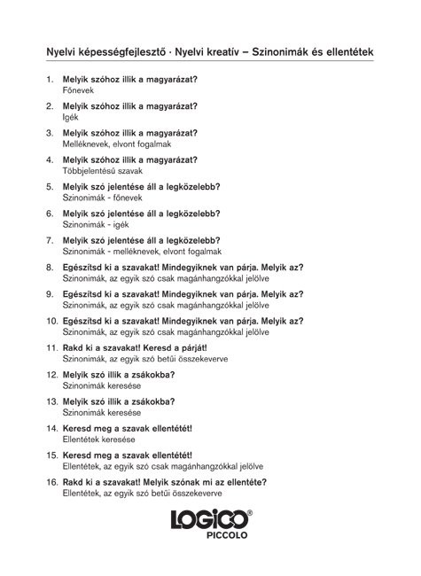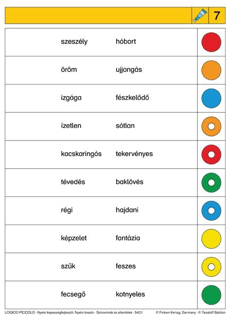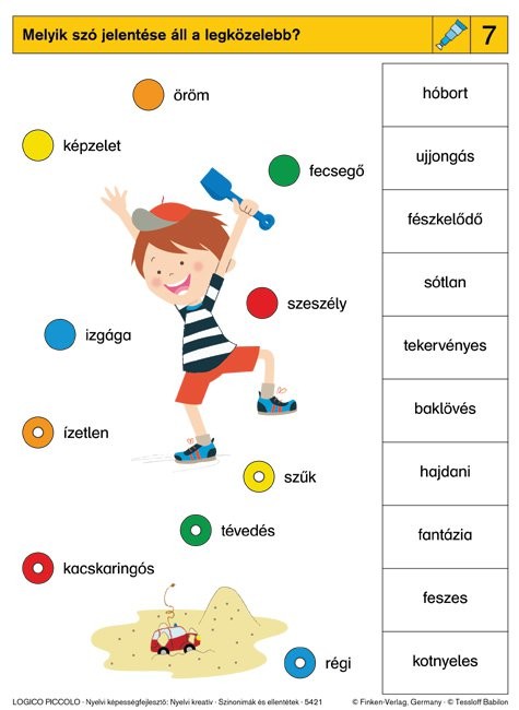 Ez a kaland minden gyermek számára nyitva áll, a szinonimák, ellentétek világának kimeríthetetlen megismerésével. Mindezzel nemcsak anyanyelvi tudásukat pallérozzák, hanem a gondolkodási folyamataikat is segítik, tanulási eredményességüket is javítják. A magyar nyelv jelentéstani kapcsolataiba belemélyedve hihetetlen kreativitás mozdítható meg a gyermeki gondolkodásban.
