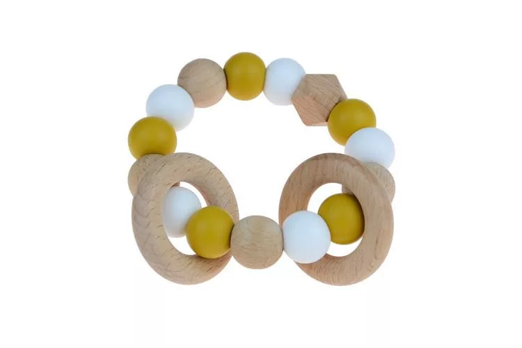 Ez a gyönyörű szilikon gyöngyökkel és kezeletlen fával díszített rágóka tökéletes a baba kis kezébe Teljesen mérgező-anyag mentes, így a kicsik a szájukba vehetik, és enyhíthetik a fogak okozta viszketést.Élelmiszer-jóváhagyott (LFGB) szilikonból készült. A szilikon az EN71 szabvány szerint engedélyezett a játékokhoz. A puha fagyöngyök és a színes szilikon gyöngyök egyszerre serkentik a baba tapintását és látását. Ø 8,5 cm.