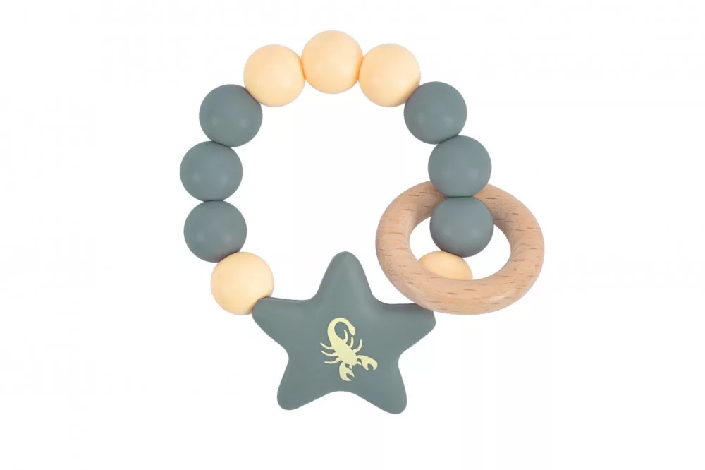 Aranyos csillagjegyes fogzást segítő rágóka, amely tökéletes ajándék babák számára. Kiváló minőségű, ellenőrzött minőségű szilikonból készült, közepén csillagjegy jelöléssel.