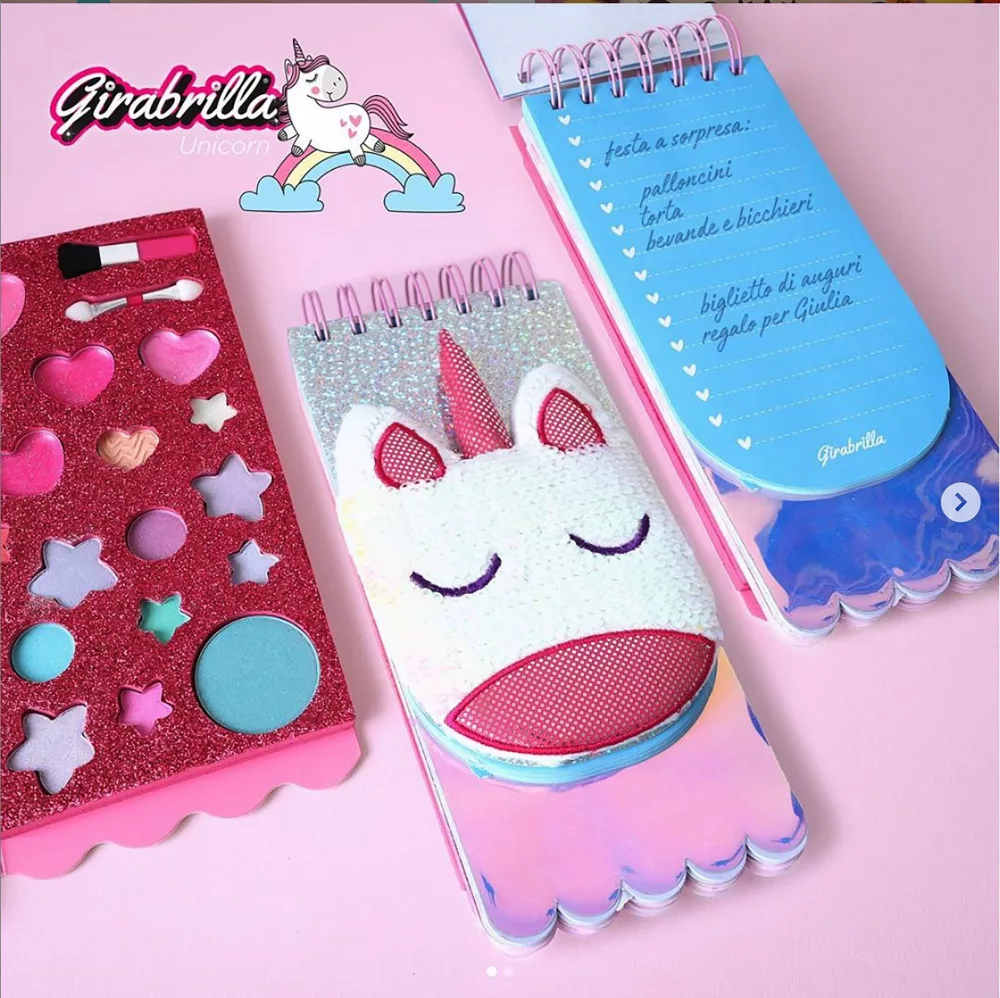 Praktikus Girabrilla unikornisos sminkkészlet flitteres noteszba bújtatva, melyben színes szemhéjfestékek találhatók. Vidd magaddal kedvenc sminkpalettád bárhová!