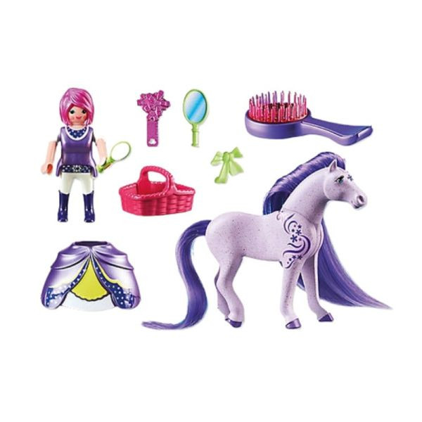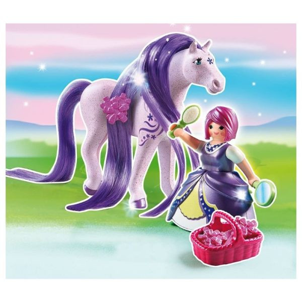 A Playmobil Princess különleges, fésülhető lovacska figura és színben hozzá illő hercegnő biztosan elvarázsolja majd a lányokat! A lila színű paripának földig érő, sötétlila sörénye és farka van. A csomagban található kefével megfésülhető és tincseibe csinos csat tűzhető. A Playmobil hercegnő figura karja mozgatható, törzse dönthető, szoknyája levehető.