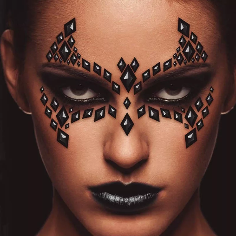Csodás arcra ragasztható, öntapadós fekete háromszög kövekből álló ékszer matrica, mely denevér mintát formál.